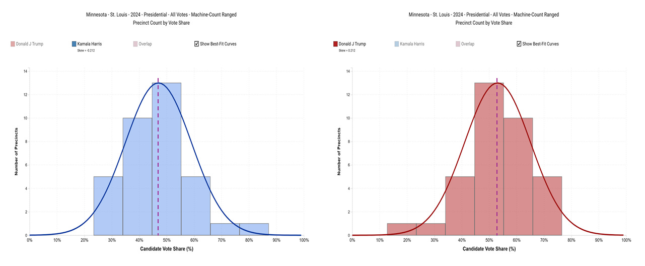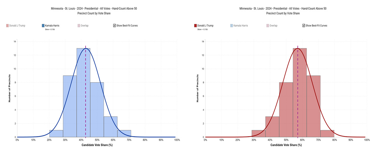 The updated St. Louis County data does revise some of the initial observations we shared on the Pakman show. However, the corrected results continue to reveal statistical concerns in the machine count results, in which vote distributions for machine count precincts appear anomalous while hand count precincts appear less so. We expect to publish our full report on this topic in the near future.