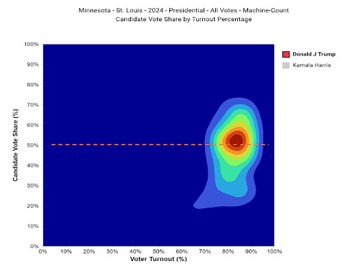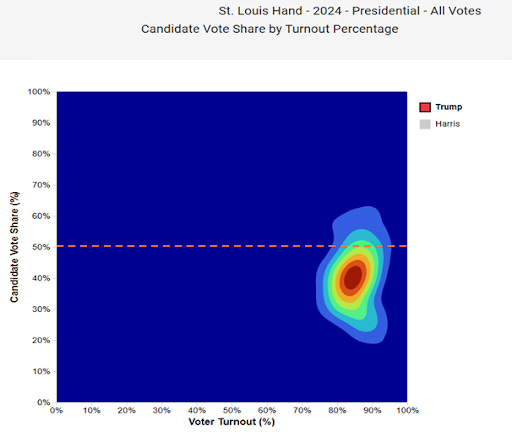 The St. Louis data shows much greater anomalies when looking at the Election Day data instead of mail-in or early voting. Here's the graph by polling place rather than precinct: https://drive.google.com/file/d/12KWrxsOT6AMnqCTu3ROO4H-TE5MZ5Vau/view?usp=sharing